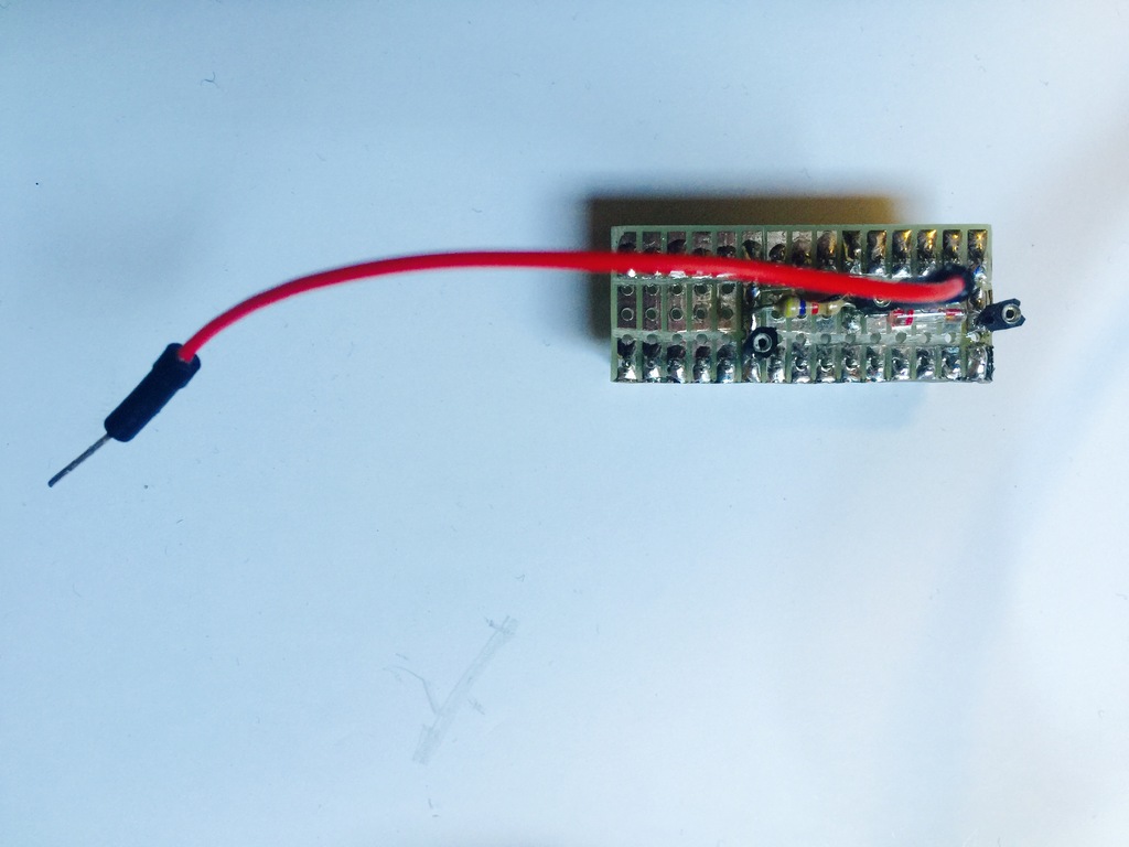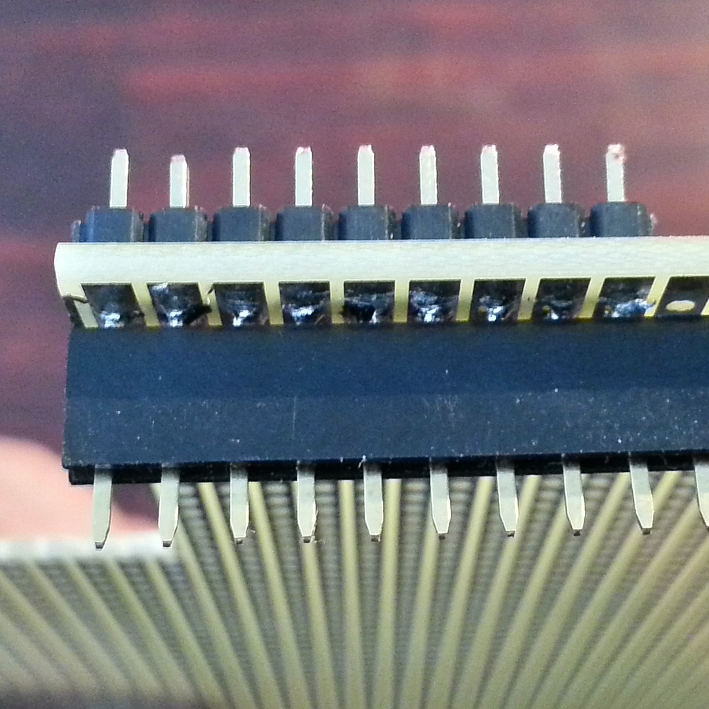 - On doit pouvoir remettre la carte dans le bon sens avec les pistes en dessous : On plante le peigne de pins par dessus (plastique au dessus). On soude "finement" par dessous (bon exercice ;-) ). On utilise une rangée de connecteurs femelles de 5.6 de haut (au lieu de ceux 8.4) comme ça on gagne un peu en hauteur et les pins restent compatibles avec les bread board (juste un peu court). Il reste aussi des pins qui dépassent au dessus de la carte que l'on peut utiliser comme point de test ou couper ensuite (en retirant le plastique). A terme les modules seront surement réalisés en dble face à trous métallisés probablement soudable par le dessus.